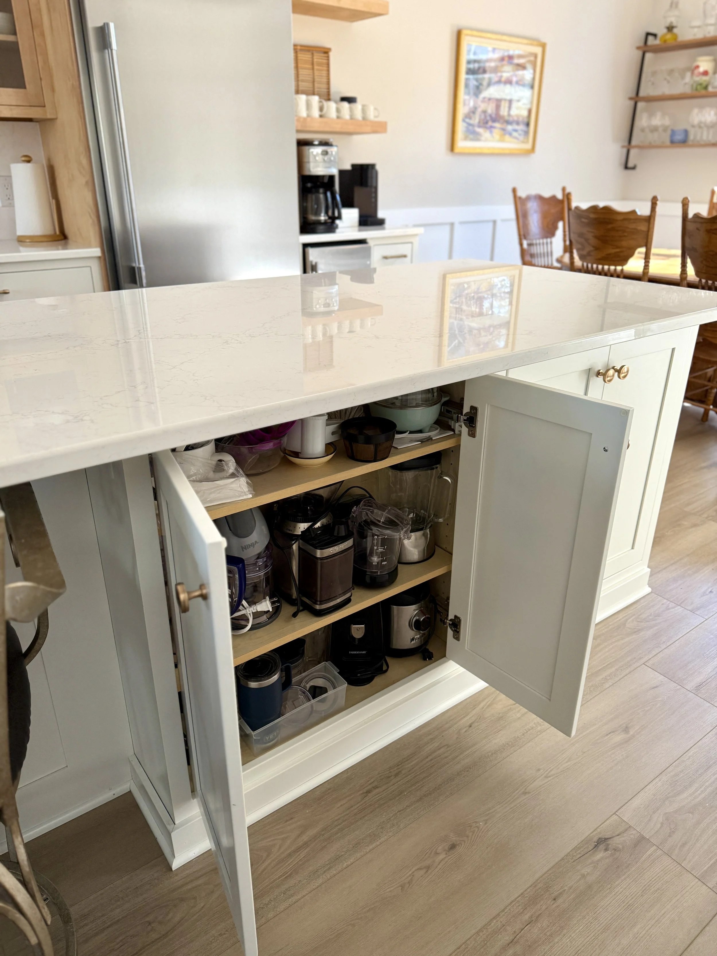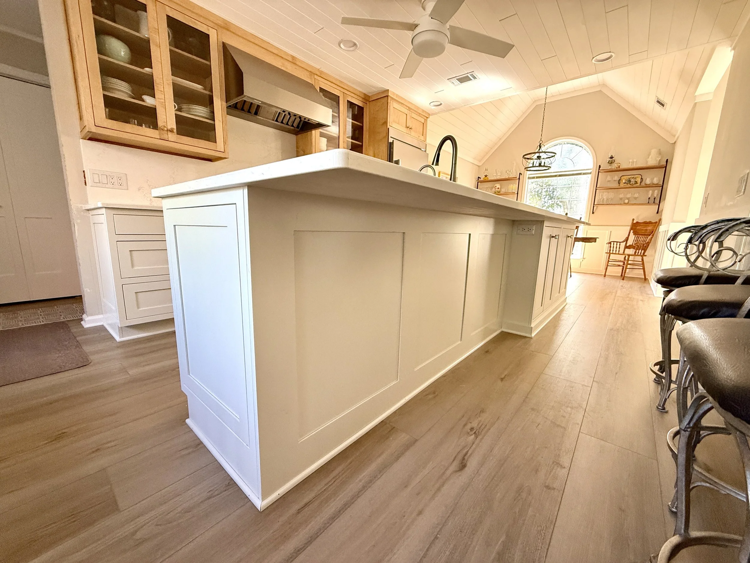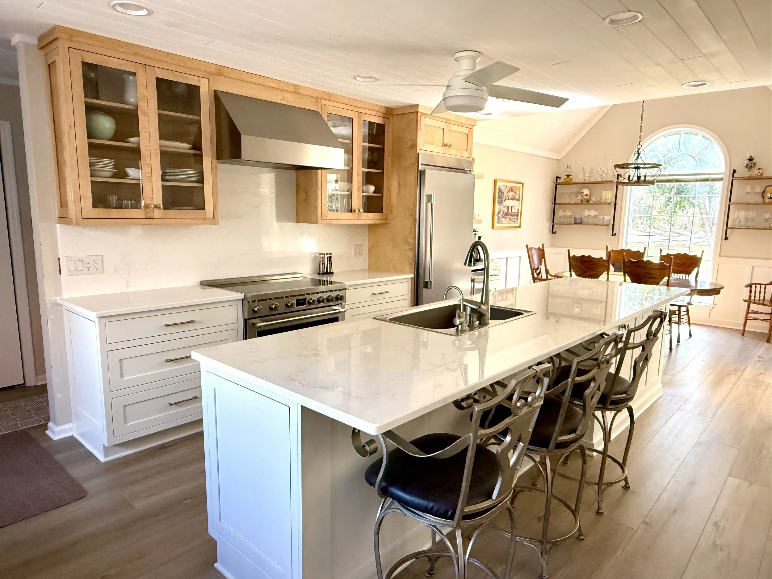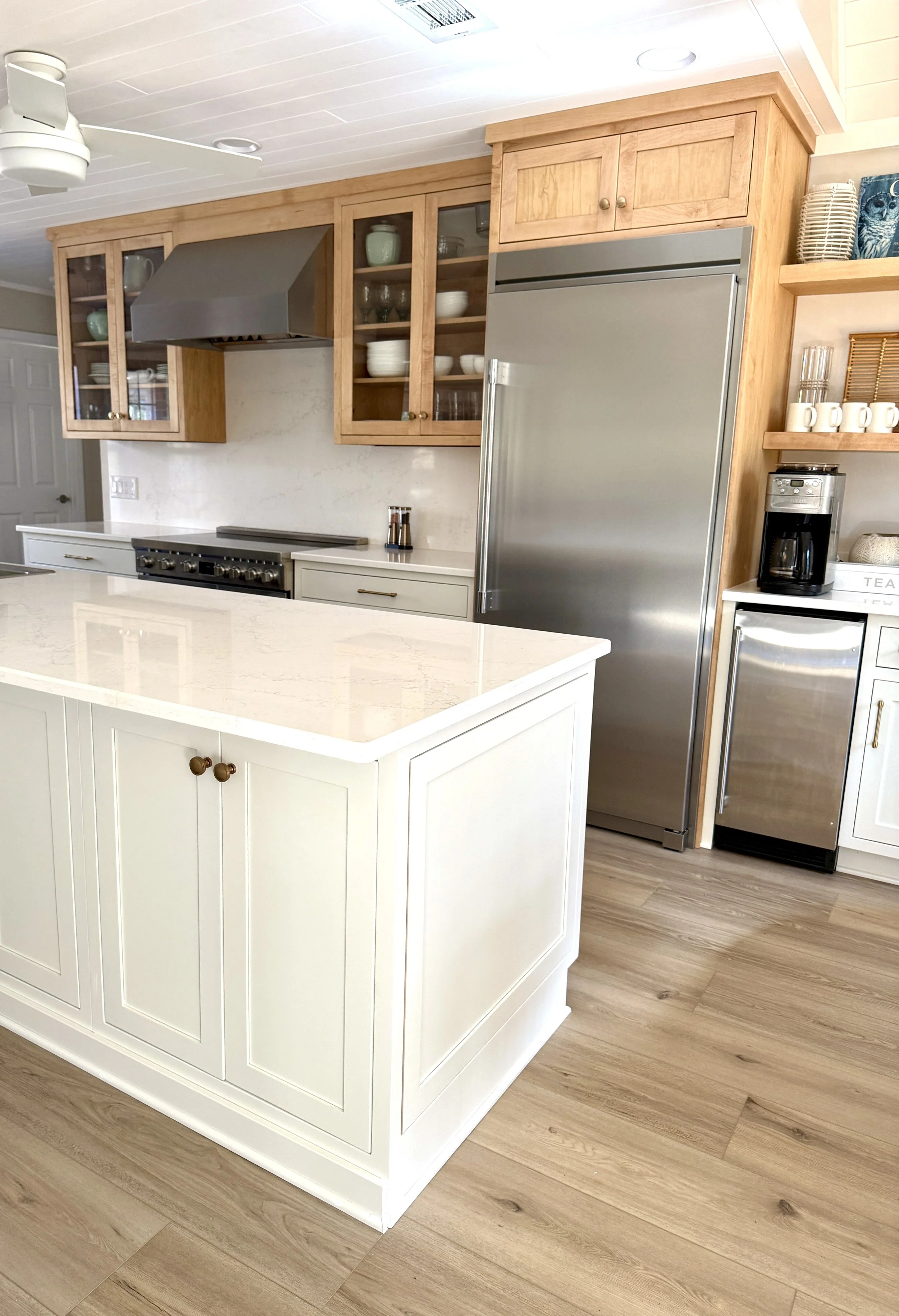 The cabinets in the photo feature a warm, natural wood finish on the upper units with glass-front doors that beautifully display dishware and add an open, airy feel to the space. The lower cabinets and island are done in a soft, light color that complements the countertops and keeps the kitchen bright and inviting.