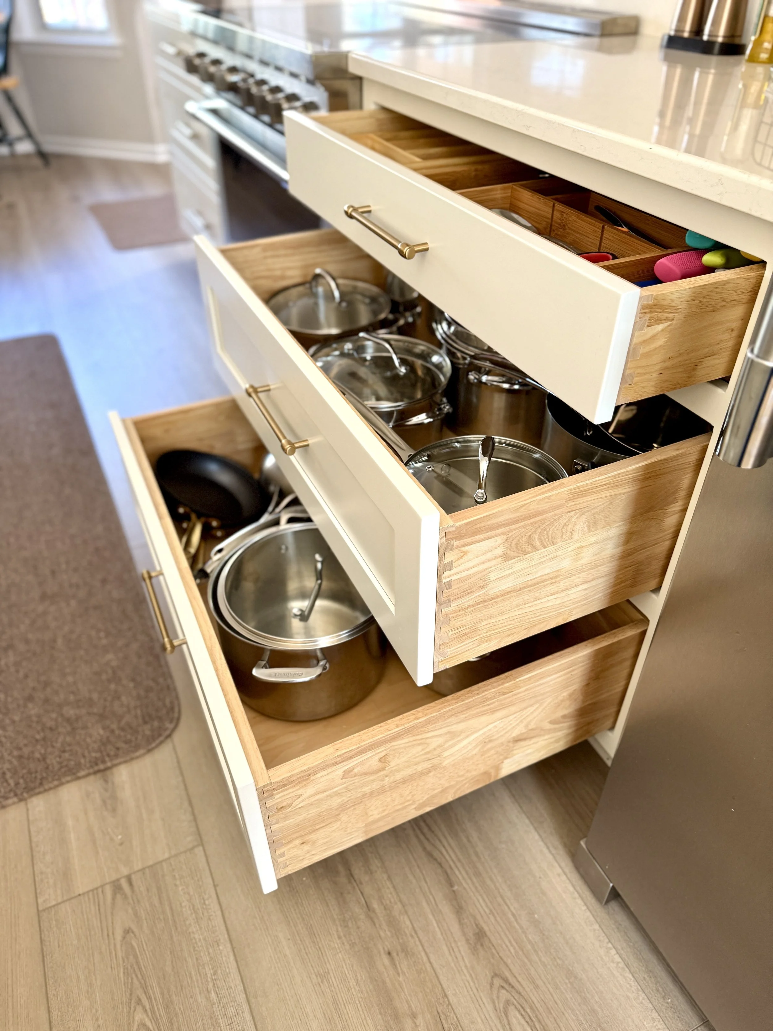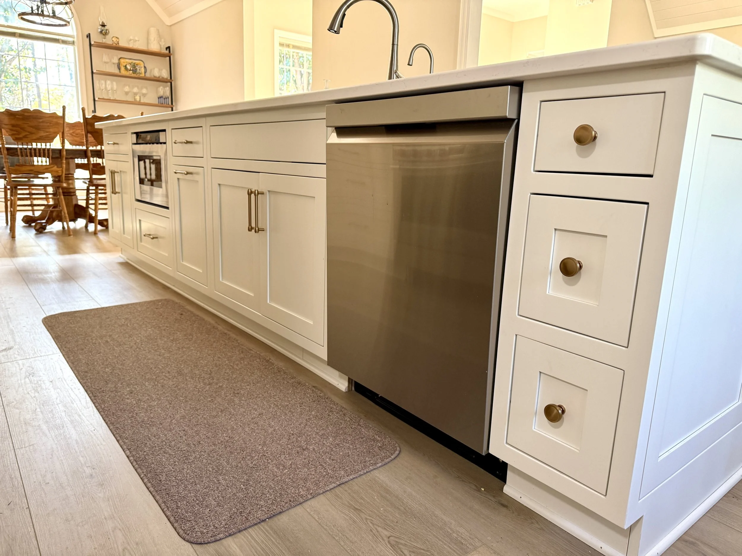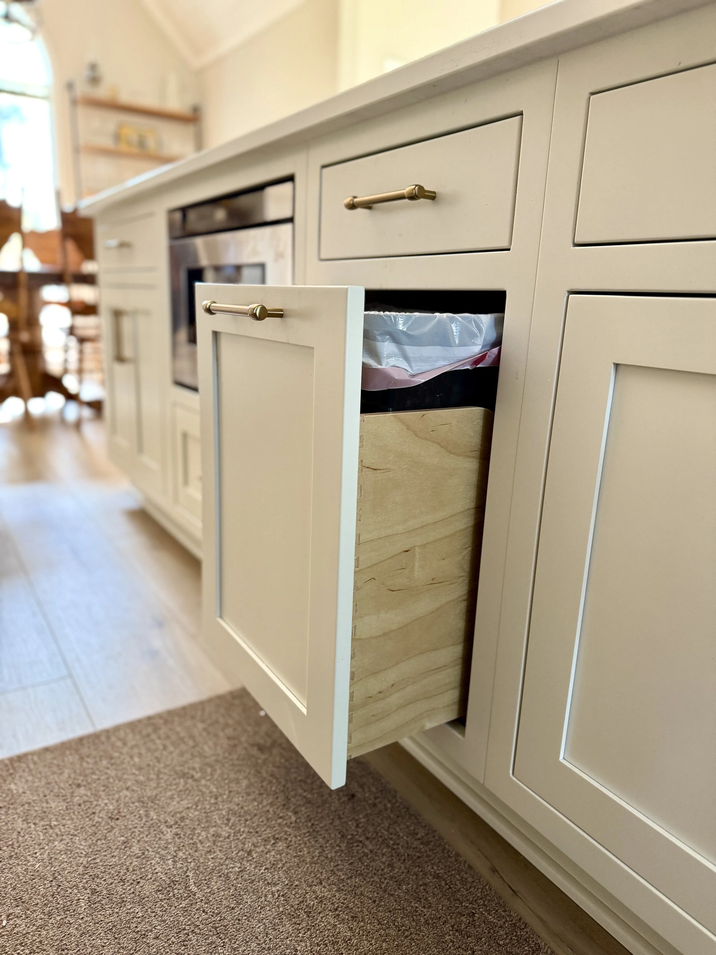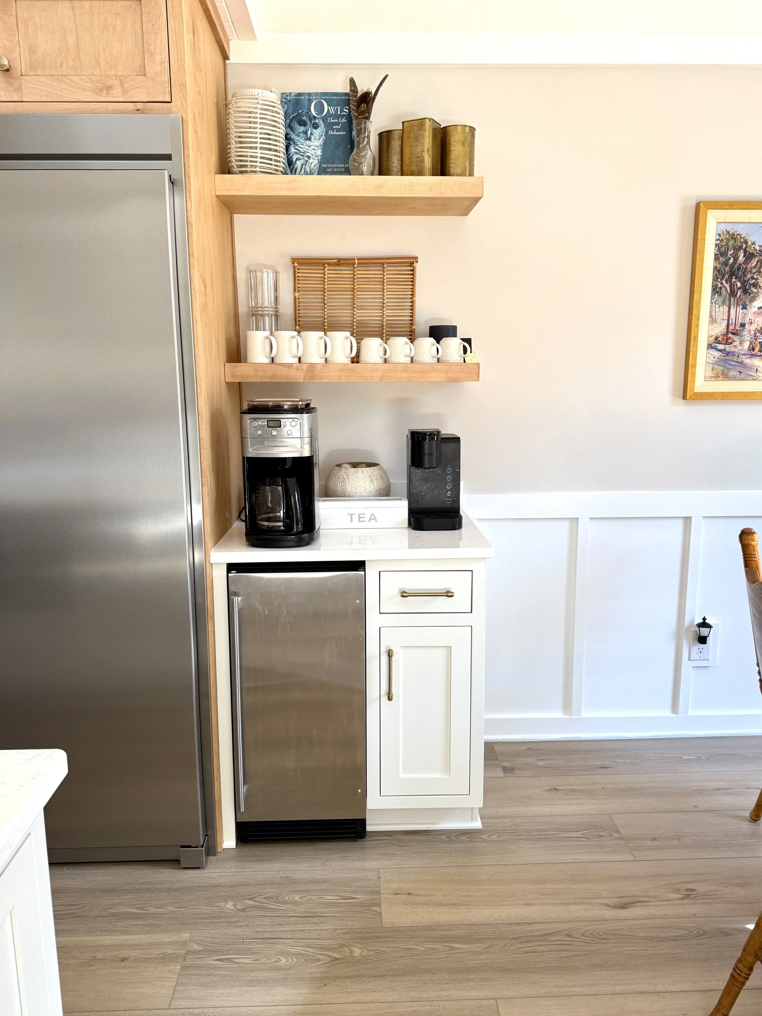 The cabinets in the photo feature a warm, natural wood finish on the upper units with glass-front doors that beautifully display dishware and add an open, airy feel to the space. The lower cabinets and island are done in a soft, light color that complements the countertops and keeps the kitchen bright and inviting.