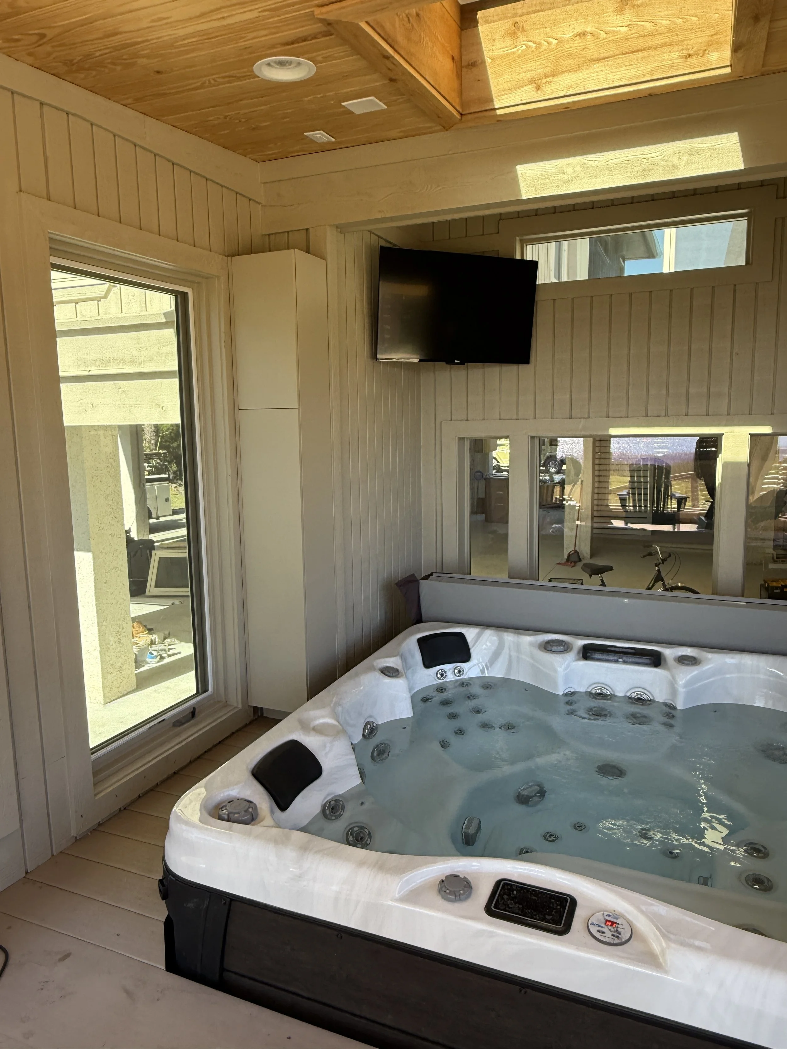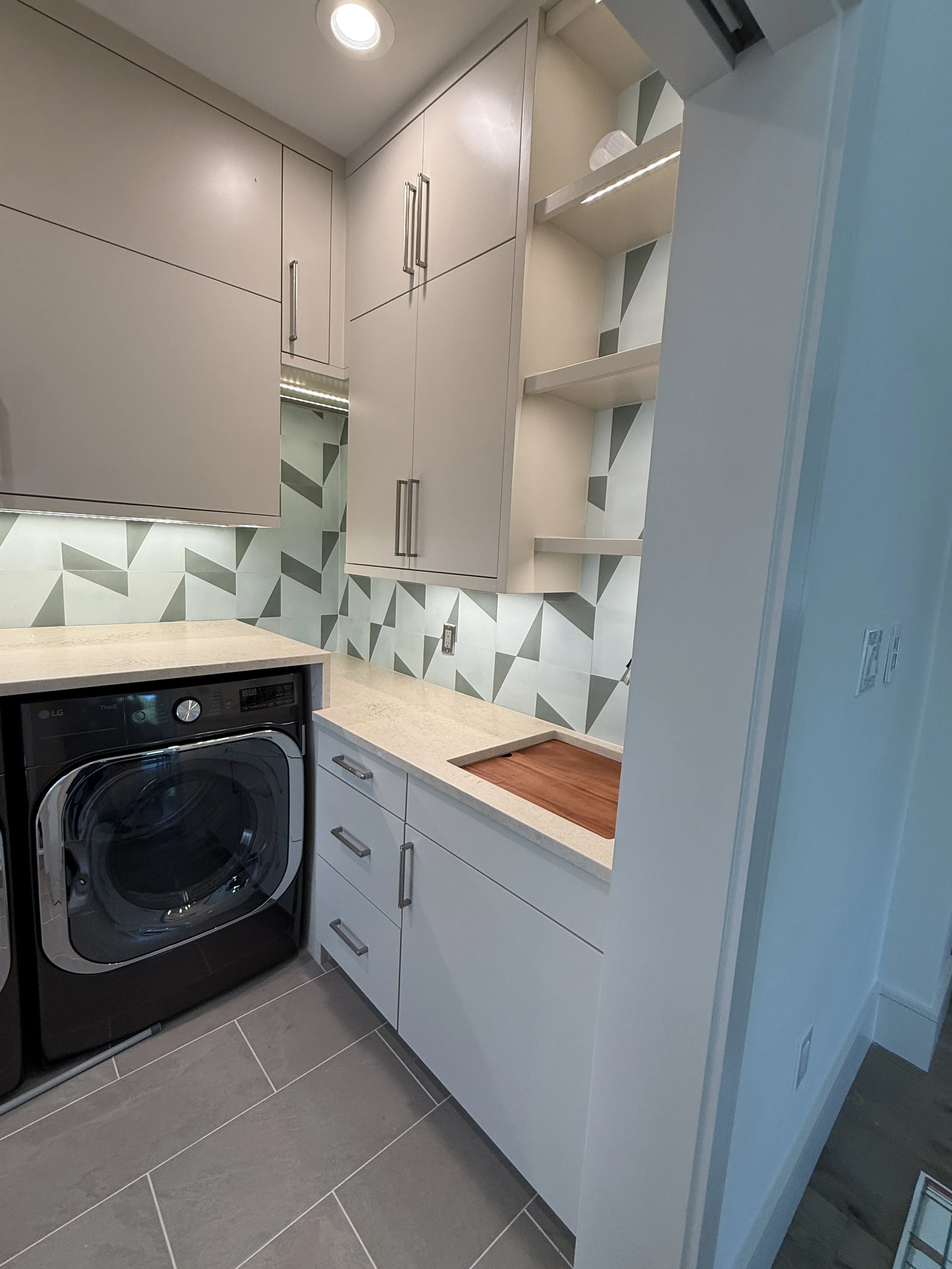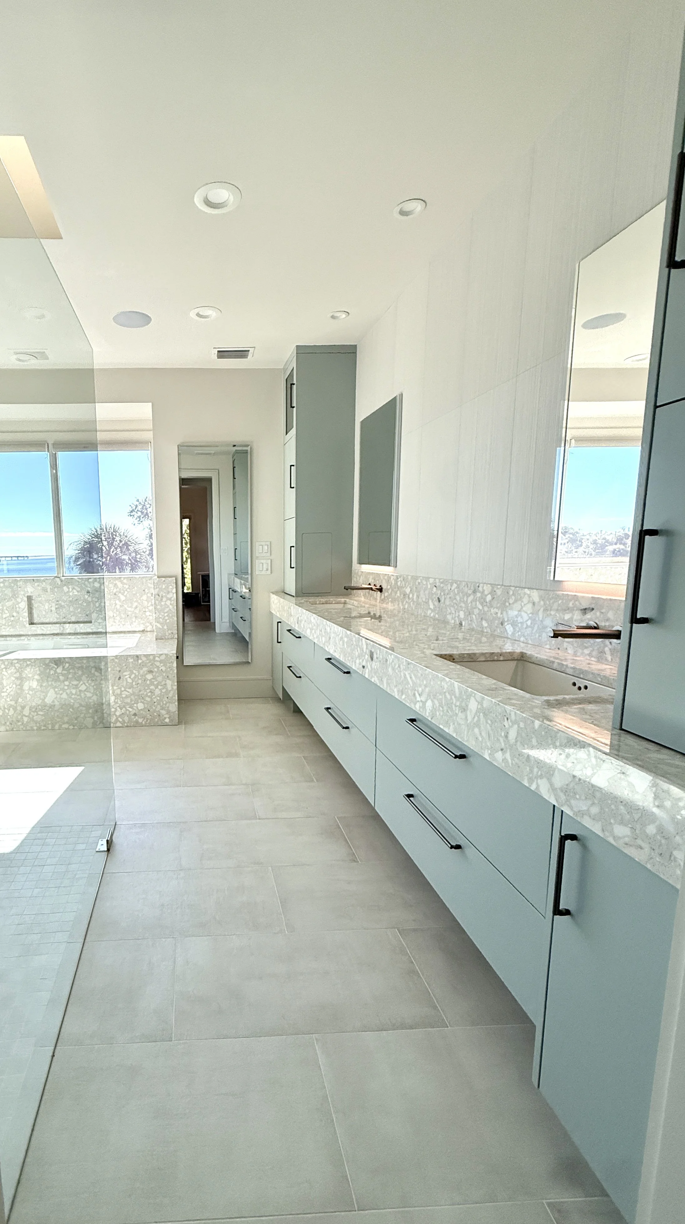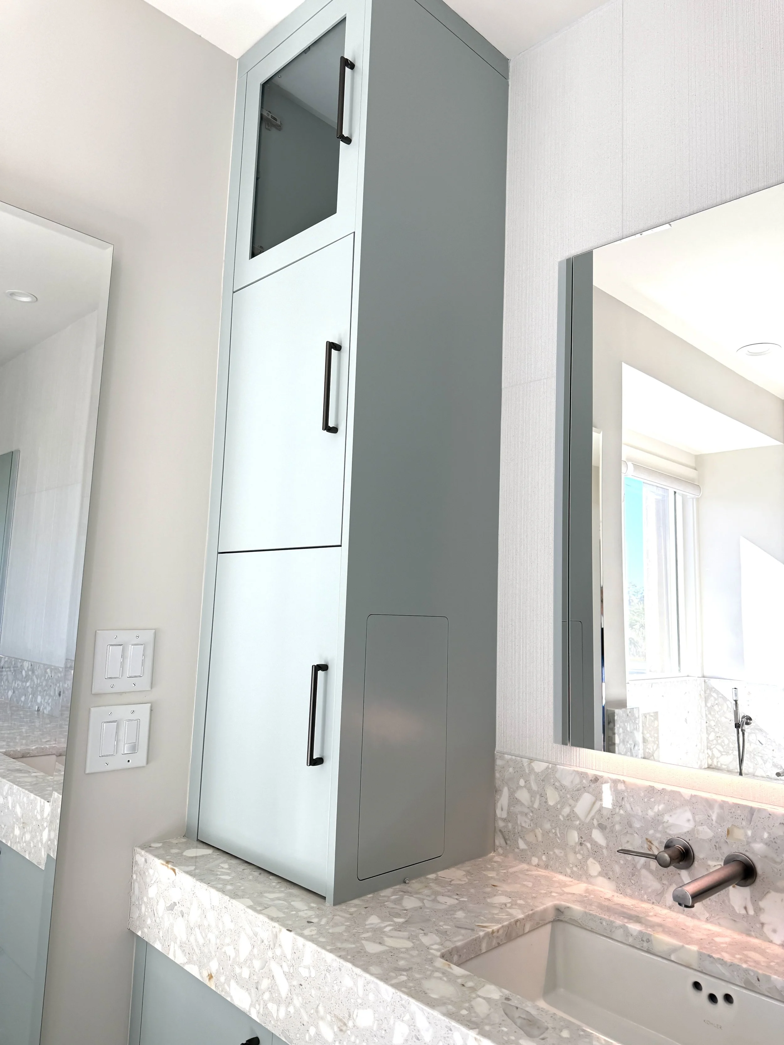 The cabinets in this bathroom have a sleek, modern design with clean lines and a soft, calming blue tone. Their flat-panel style and long black hardware give them a contemporary, minimalist feel. The floating installation adds to the spaciousness of the room, while the light, patterned countertop beautifully complements the cabinetry for a bright, airy look.