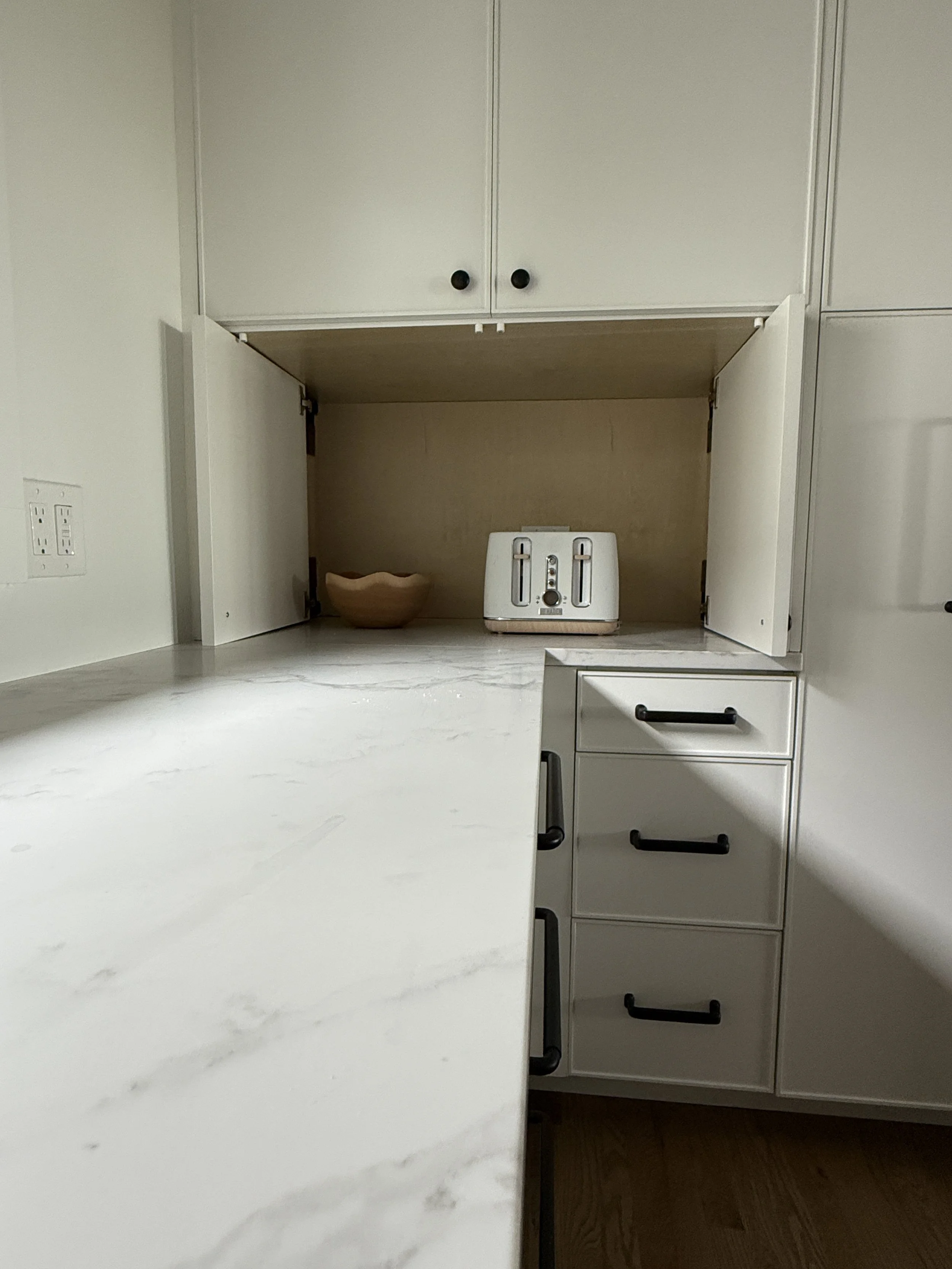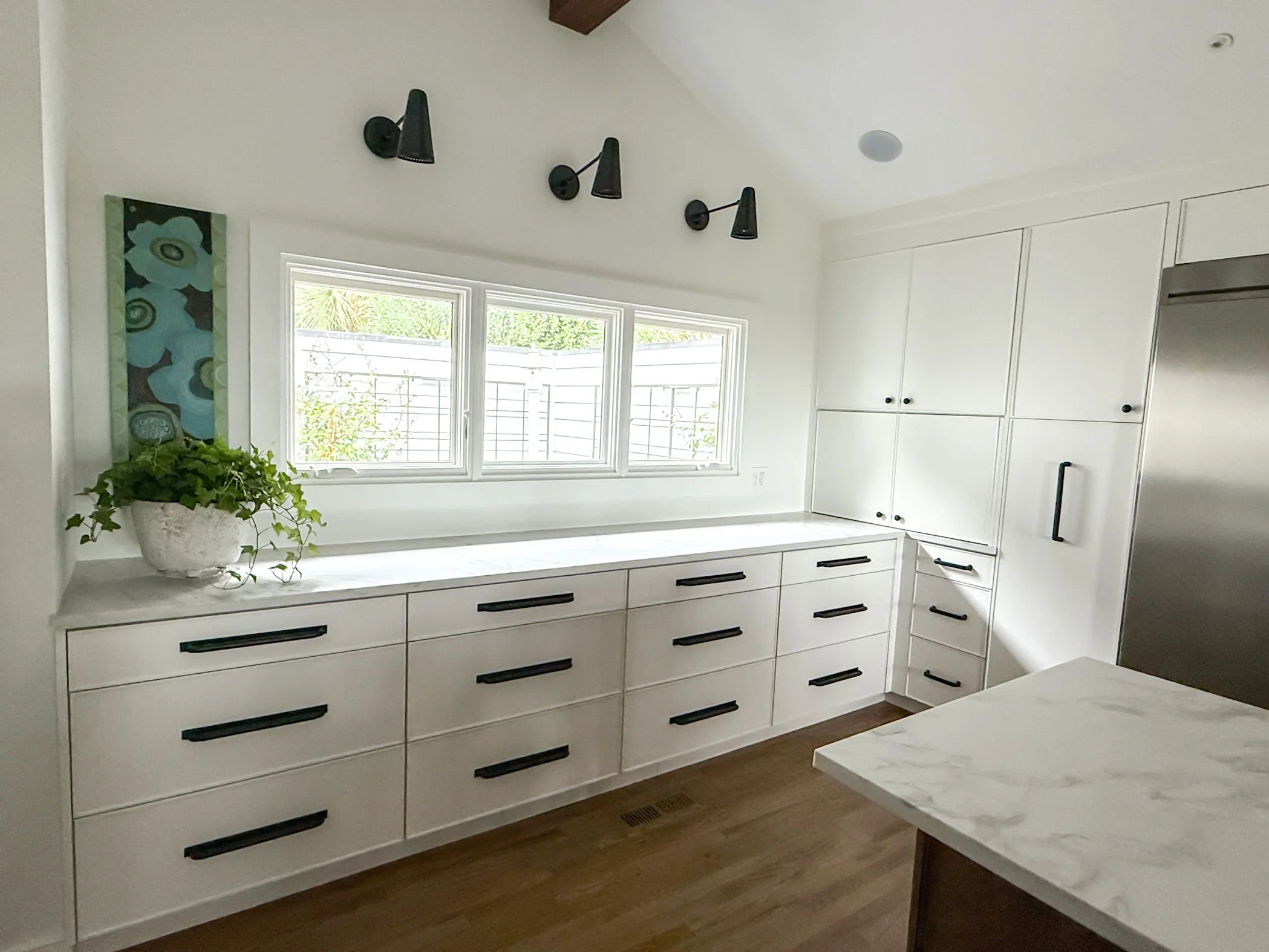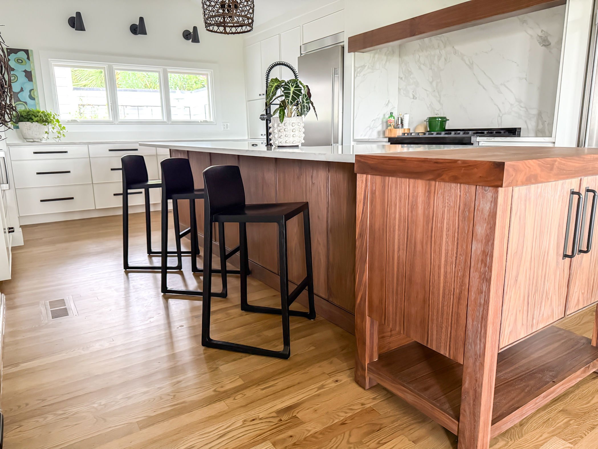The natural wood island cabinets add warmth and texture, creating a balanced contrast.